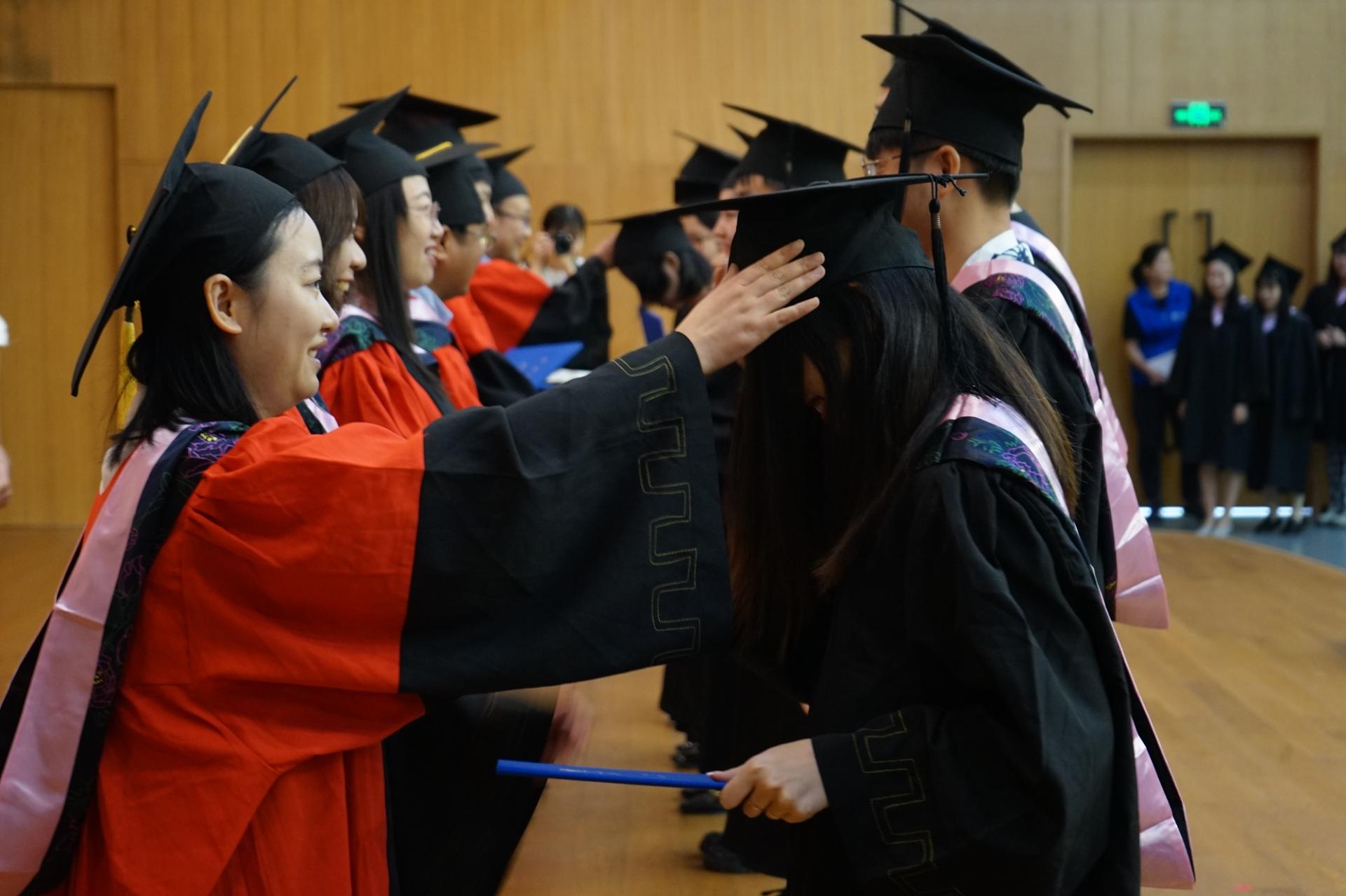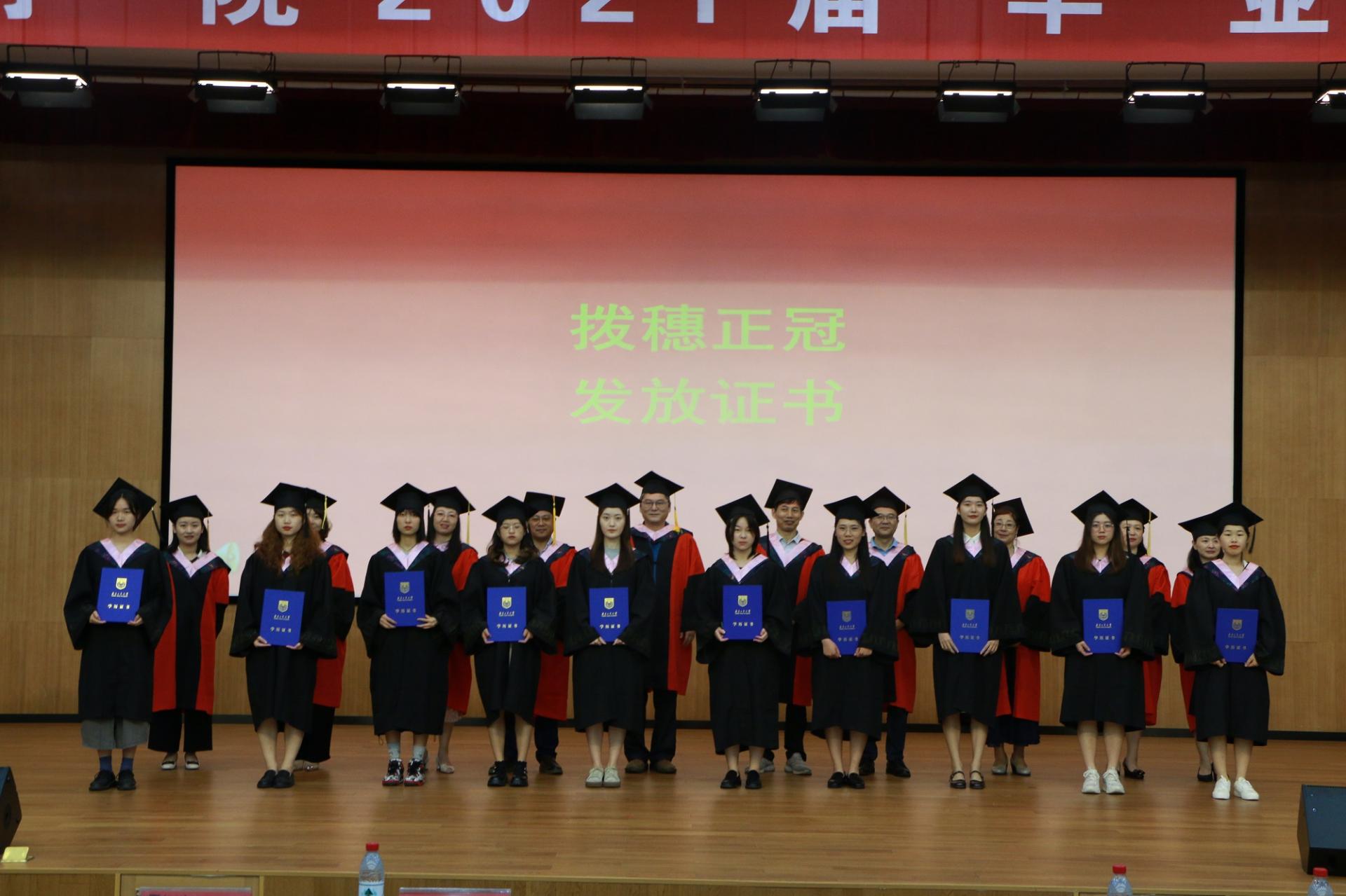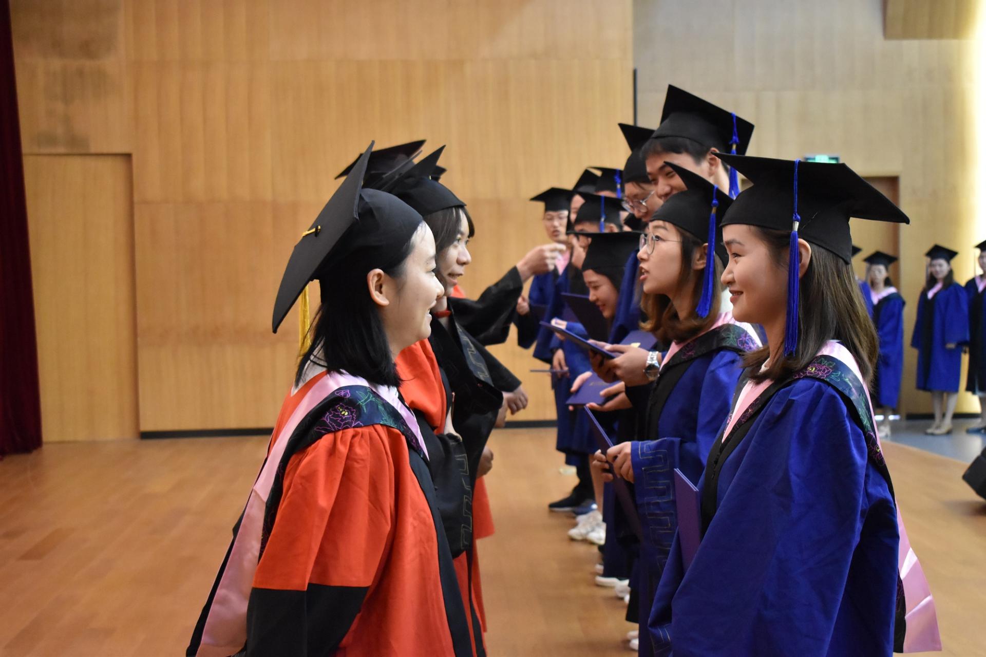 随后,伴随着激扬的音乐,现场四百余位毕业生依次登台,导师为毕业生一一拨穗正冠、颁发学位证书。最后,全体毕业生与导师们一同观看了由任课教师、毕业生家长、优秀员工录制的毕业祝福寄语。