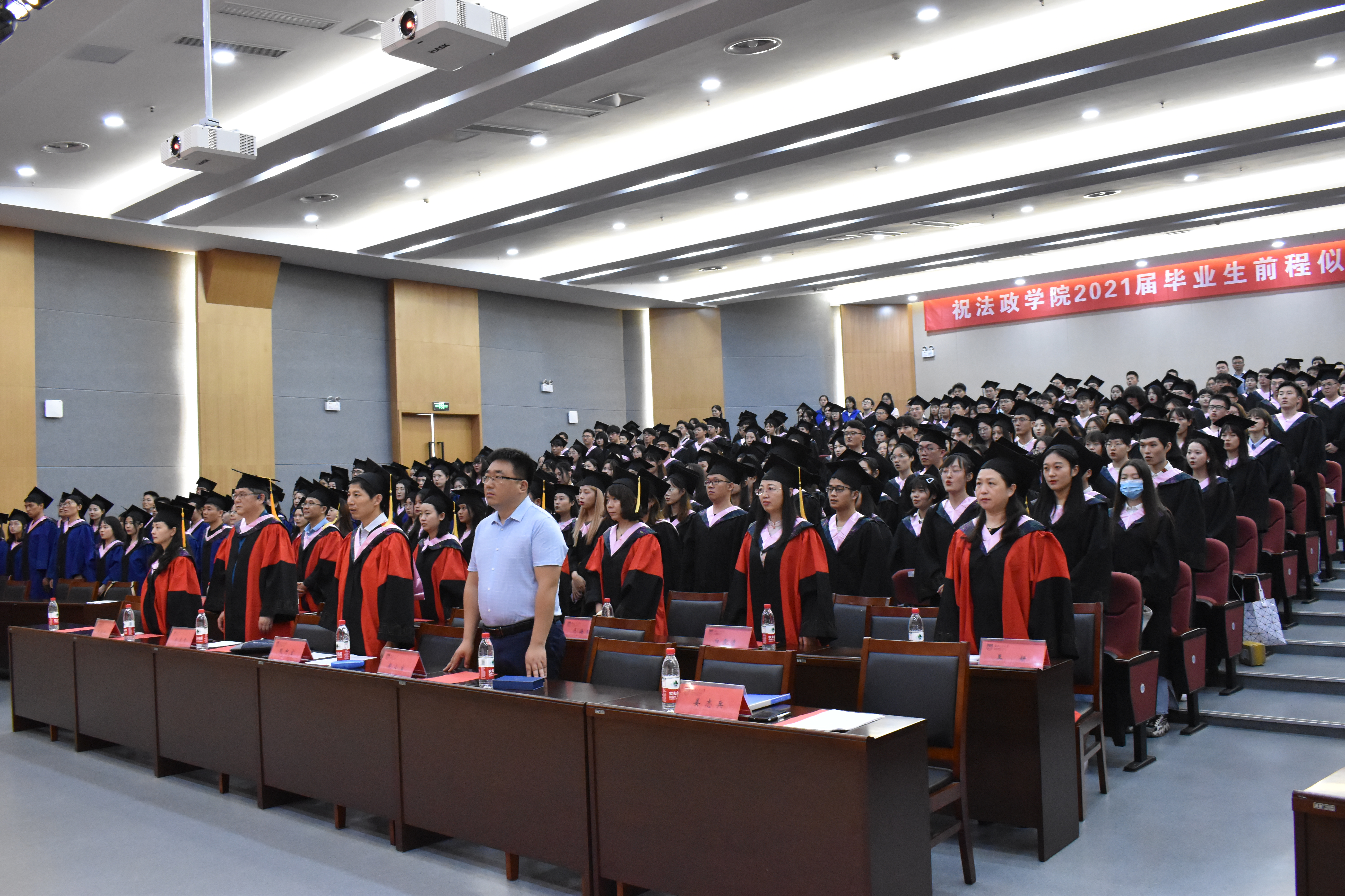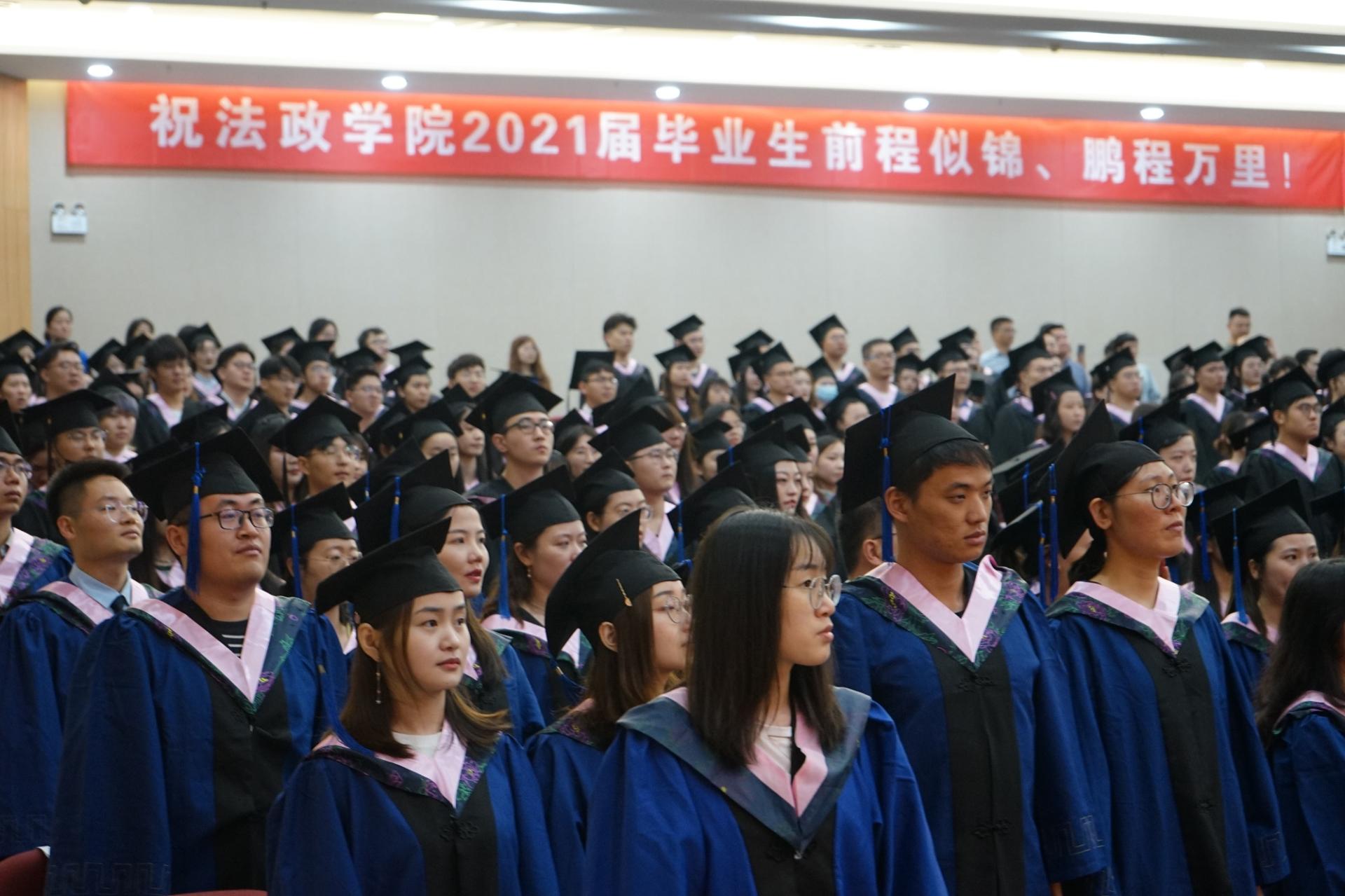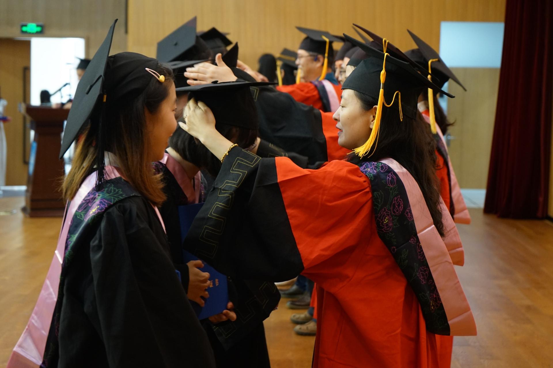 随后,伴随着激扬的音乐,现场四百余位毕业生依次登台,导师为毕业生一一拨穗正冠、颁发学位证书。最后,全体毕业生与导师们一同观看了由任课教师、毕业生家长、优秀员工录制的毕业祝福寄语。