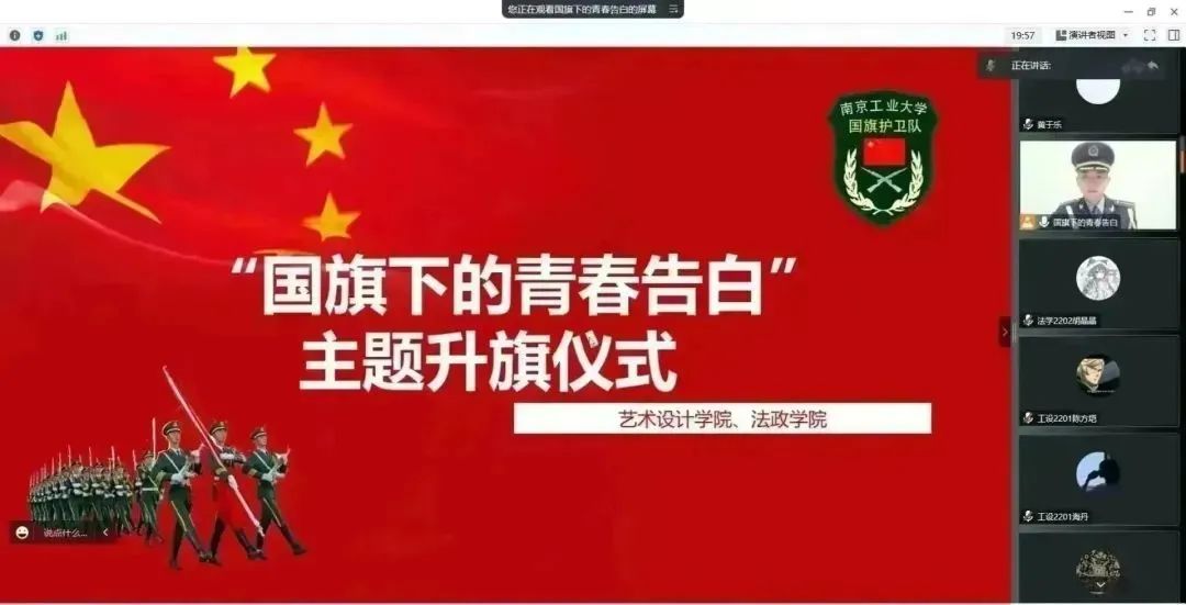 国旗护卫队向大家普及《国旗法》《国歌法》的相关知识。上午7时,升旗仪式以直播形式开始。在庄严的国歌声中,鲜艳的五星红旗冉冉升起。礼毕,队列示范班进行队列展示。艺术设计公司员工代表蔡诗铭以“学习二十大,奋进新征程”为主题发言。她表示,广大青少年是社会的脊梁,是整个中华民族的脊梁,作为南工学子,我们应学习贯彻党的二十大精神,牢记“明德、厚学、沉毅、笃行”校训,敢于担当、勇于奋斗,以豪情攻克艰难险阻,以壮志谱写时代华章。