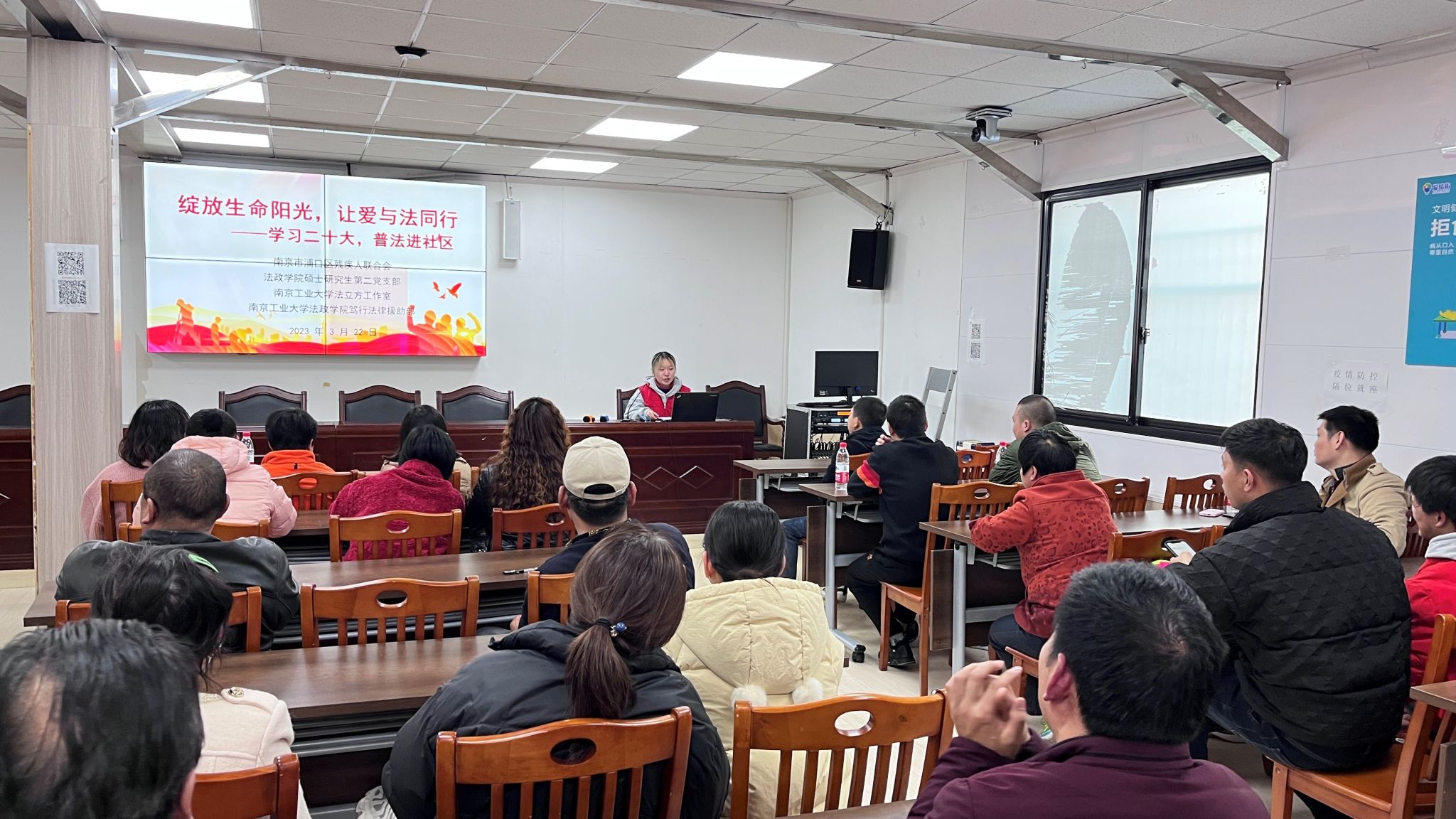 为推动辖区居民树立遵守法律的意识,落实二十大精神中关于“增进人民福祉,提高人民生活品质”的指示,3月22日下午,太阳成tyc122cc硕士研究生第二党支部联合南京市浦口区残疾人联合会、太阳成tyc122cc法立方工作室、太阳成tyc122cc笃行法律援助部共同开展“学习二十大,普法进社区——绽放生命阳光,让爱与法同行”普法宣讲活动,带领居民了解生活中的法律,提高防范意识,护航美好生活。