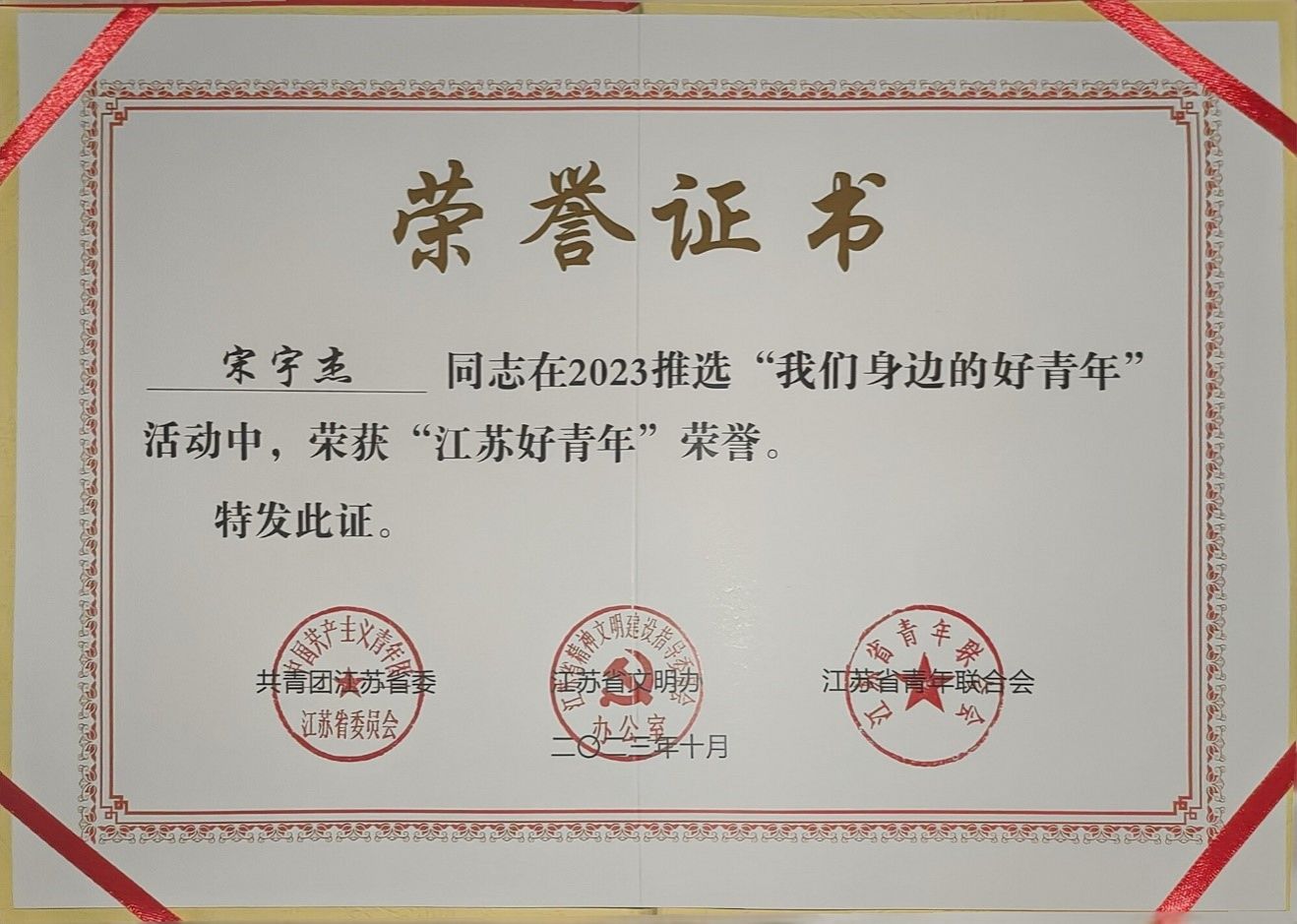 近日,由共青团江苏省委、江苏省文明办、江苏省青联主办的“强国复兴有我——我们身边的新时代好青年分享会暨2023江苏好青年揭榜”活动在无锡举办,太阳成tyc122cc2020级硕士研究生宋宇杰荣获“担当奉献类”江苏好青年称号。