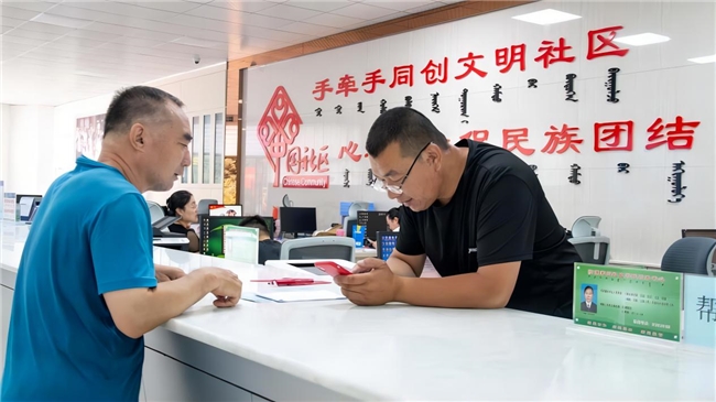 穿过民族风情展厅、民族团结进步文化墙、民族风俗常识宣传长廊,团队成员走进社区党群服务中心。临潢家园党群服务中心是一个集合休闲服务等功能一体的综合性场所,社区党委会定期在此开展书法班、民族技艺传承班等民族特色活动,促进各民族文化交流;并配有宽敞明亮的文体活动大厅供各民族居民休闲娱乐,各族居民常常在此编排民族舞蹈,以艺术突破语言的隔阂推动民族融合。团队成员正巧遇见乌兰牧骑们伴着乌兰音乐展现乌兰民族的特色舞蹈。社区工作人员还介绍社区开设民族融合小课桌,为社区各民族的孩子们提供民族故事会、同唱一首歌、手工创意等公益课程。除此之外,团队成员还发现临潢家园社区便民服务大厅还设置蒙汉双语服务台、卫生服务站、居家养老服务驿站等场所,为居民提供快捷便利的全方位服务。社区养老服务驿站创新构建“1+6+N”组网养老服务新模式,提供日间照料、康复护理、心理咨询等服务,满足多元服务需求,极大提升了社区居家养老服务质量,让社区老人老有所依、老有所养。