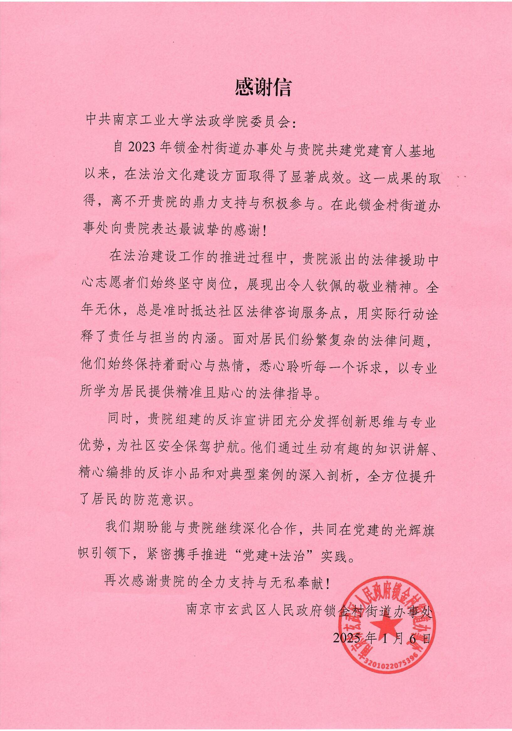 1月6日,南京市玄武区人民政府锁金街道办事处向公司党委发来感谢信,感谢太阳成tyc122cc在双方共建党建育人基地、推进锁金村街道法治文化建设方面提供的支持,并充分肯定了公司派出的法律援助中心志愿者们坚守岗位、全年无休的敬业精神。