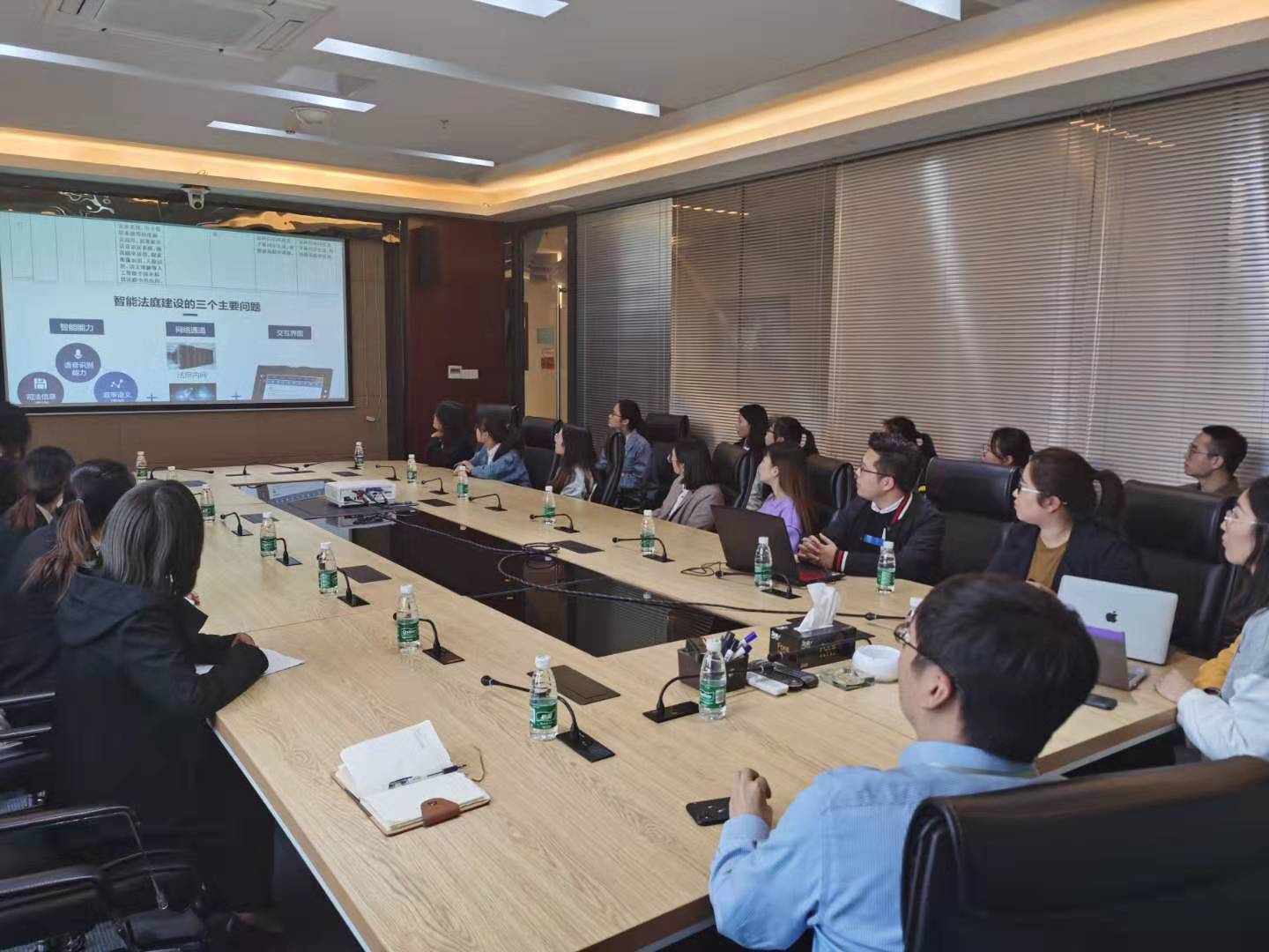 周航滨副总首先带领同学们参观了智能设备研发中心、服务中心、软件与平台研发中心、司法辅助解决方案部以及直播后台监控中心,介绍了“互联网+”背景下司法公开与互联网平台结合的新兴产业链。孟祥媛经理介绍了如何通过“云上法庭”系列产品对司法工作进行有效、全面的主辅分离、实现“智慧法庭”。周总介绍了公司目前的发展战略、人才培养方案、员工待遇福利等事宜后,同学们围绕法科生如何更好地在互联网公司发挥作用进行了深入的交流。双方还就建立实习实践基地等事宜达成了初步共识。