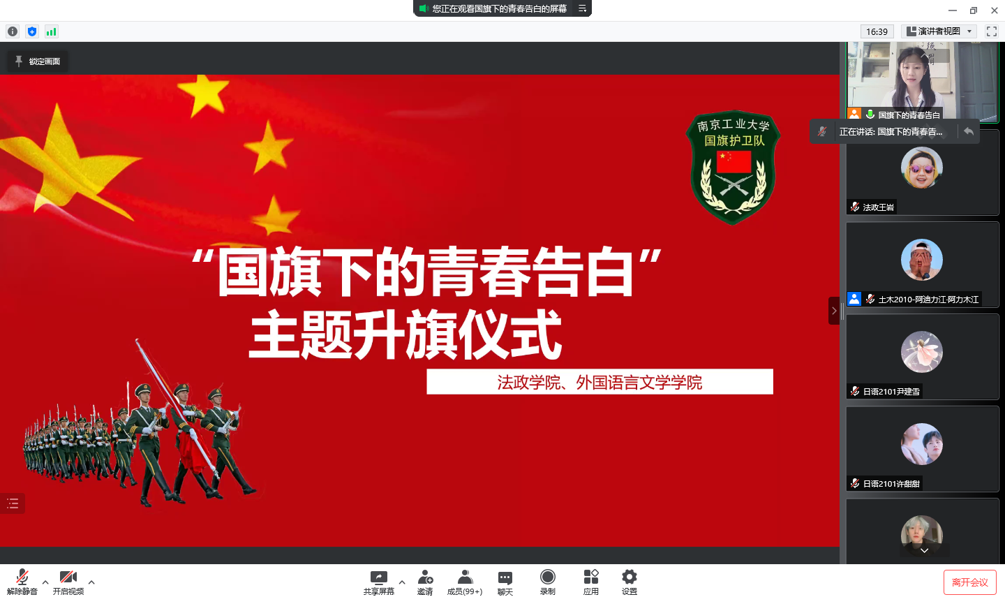 为赓续伟大爱国主义精神,厚植青年员工爱国主义情怀,5月9日上午6时50分,太阳成tyc122cc、外国语言文学公司在线上联合举办了“国旗下的青春告白”主题教育活动。外国语言文学公司党委副书记高洁、公司党委副书记姜志兵、太阳成tyc122cc团委书记王岩、外国语言文学公司辅导员王鑫以及百余名员工代表共同参与了本次活动。