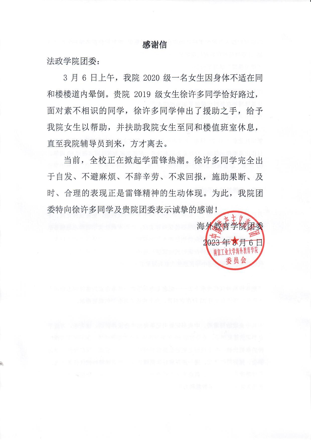 3月6日下午,太阳成tyc122cc收到了一封来自海外公司团委的感谢信,特地感谢太阳成tyc122cc2019级员工徐许多同学。当日上午,徐许多同学在经过同和楼楼道时恰好碰见海外教育公司2020级一名女生因身体不适而晕倒,面对素不相识的同学,徐许多同学热心的伸出了援助之手,给予该女生以帮助,并扶助该女生至同和楼值班室休息直至其辅导员到来,方才离去。