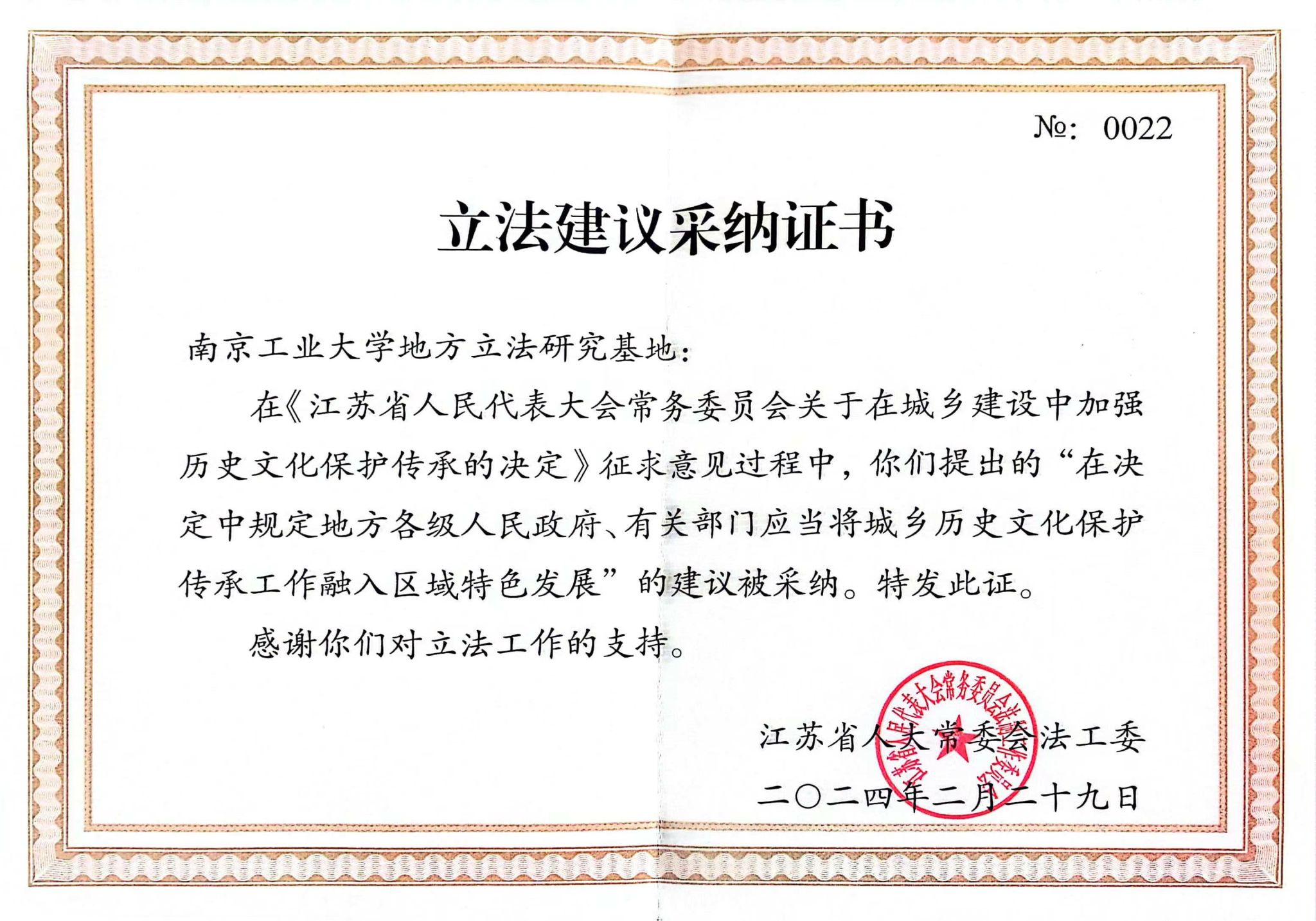 太阳成tyc122cc地方立法研究基地针对《江苏湿地保护条例》《江苏省人民代表大会常务委员会在城乡建设中加强历史文化保护传承的决定》的两条立法建议被江苏省人大采纳,近日,江苏省人大常委会法工委为基地专门颁发了立法建议采纳证书。