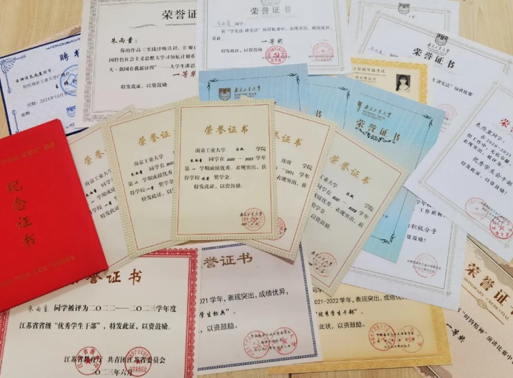 长此以往,朱雨童在本科三年的学习期间,在学业上取得了较为可人的成绩,顺利地一次性高分通过英语四、六级考试,考取了全国计算机二级证书,专业排名位居第一。在各项竞赛方面,朱雨童获得了例如“外教社·词达人杯”全国老员工英语词汇能力大赛并全国二等奖、江苏省特等奖、LSCAT江苏省笔译大赛三等奖、校“学宪法 讲宪法”演讲比赛一等奖等奖项。“你不是笨蛋,你只是比其他人花更多时间成功而已”,兴许是这句被她写在高三奋斗榜的话,又或是心中一直燃烧的闯劲,朱雨童一直努力将每件小事做好做实,才成就了现在这样积极上进的她。