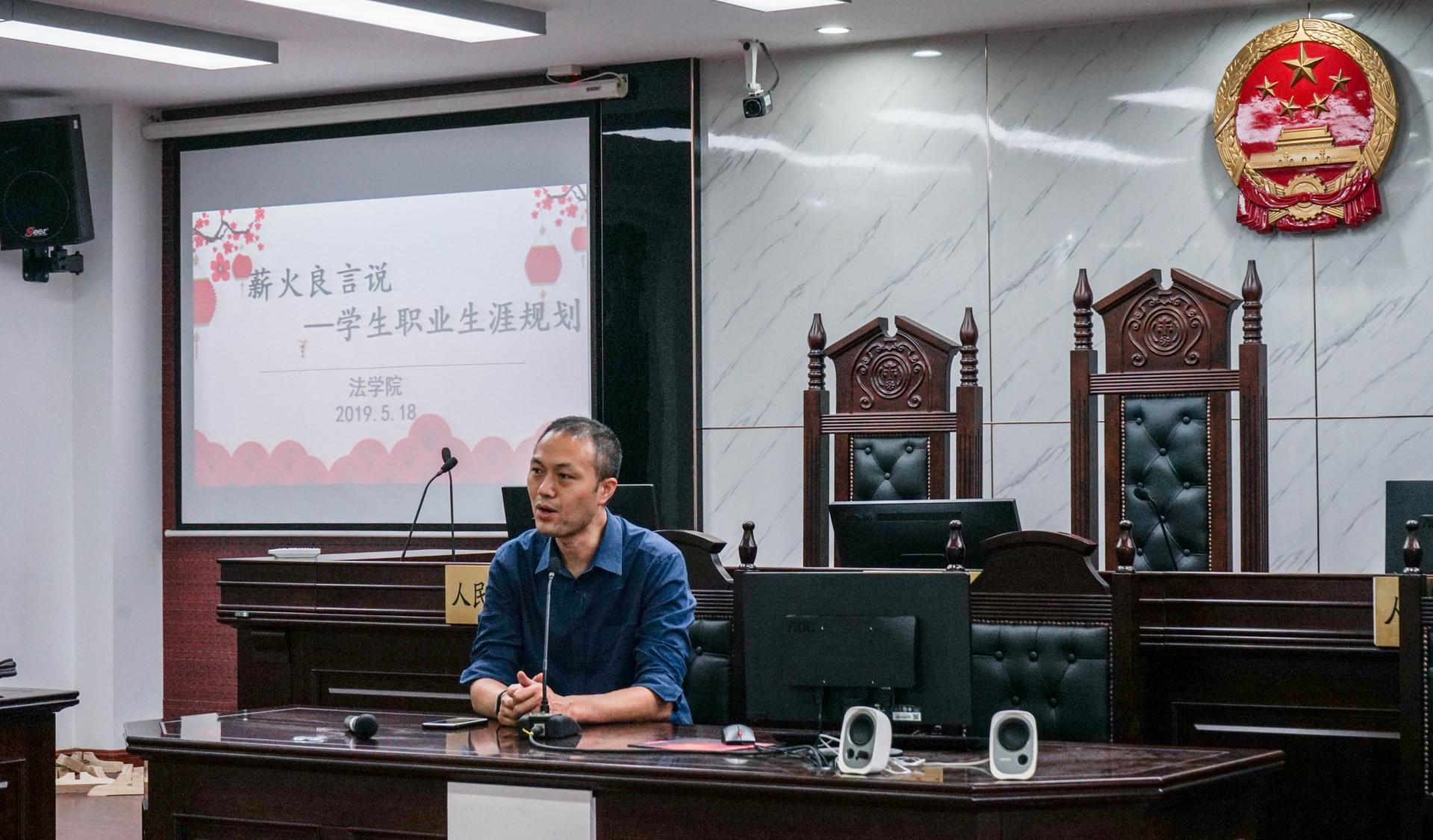 2019年员工返校日之际,法公司于5月18日上午在明德楼一楼模拟法庭举办“奋斗的青春最美丽——法公司第二期员工讲坛”。公司优秀员工上海景元国际贸易有限公司黄译、北京盈科(南京)律师事务所彭思远、苏州漕湖国家经济技术开发区侯琪应邀主讲,帮助同学们合理规划考研、出国以及就业方向,法公司学办主任孙阳老师主持讲坛。